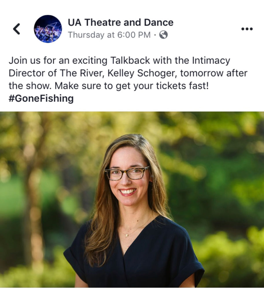 I served as Intimacy Director for The River in the fall of 2019 at University of Alabama, this being the first production to have an ID on the creative team. I brought this work to the department having started my training in this important area earlier that year. I taught intimacy best practices, helped choreograph moments of staged intimacy, and led a departmental talkback on the topic. Please scroll through the gallery for several images of these moments.